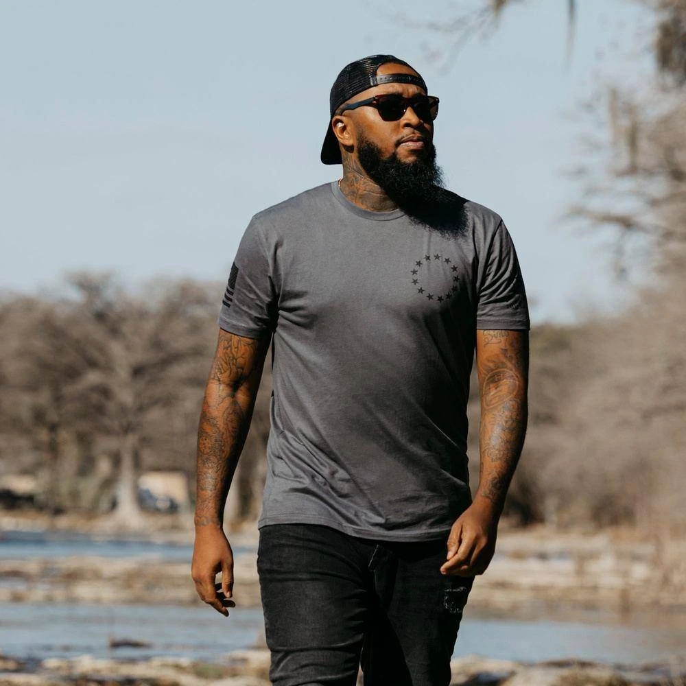 There is nothing that screams America more than the original American flag with some guns! Our Betsy Rifle flag shirt features an original United States of America flag including rifle barrel stripes and a circle of thirteen stars, to honor the original colonies, on the front left chest, making it the most patriotic shirt you’ve ever seen. So what are you waiting for? Add this badass shirt to your cart today and wear it proudly, as a true American patriot should!