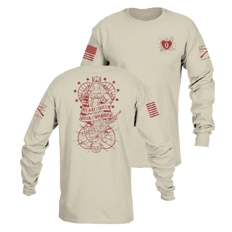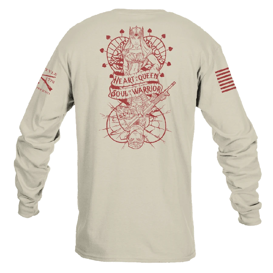 For all the badass women out there, there is the badass design of the Heart of a Queen, Soul of a Warrior! She is more than tough, she is a warrior that defends and protects. This unique design reflects the inner warrior in so many women serving our country in a variety of ways! From our military to first responders to all the women kicking ass every day in their own ways, you deserve a design that is as badass as you are! Order your Women’s Heart and Soul of a Warrior Long Sleeve Tee today!