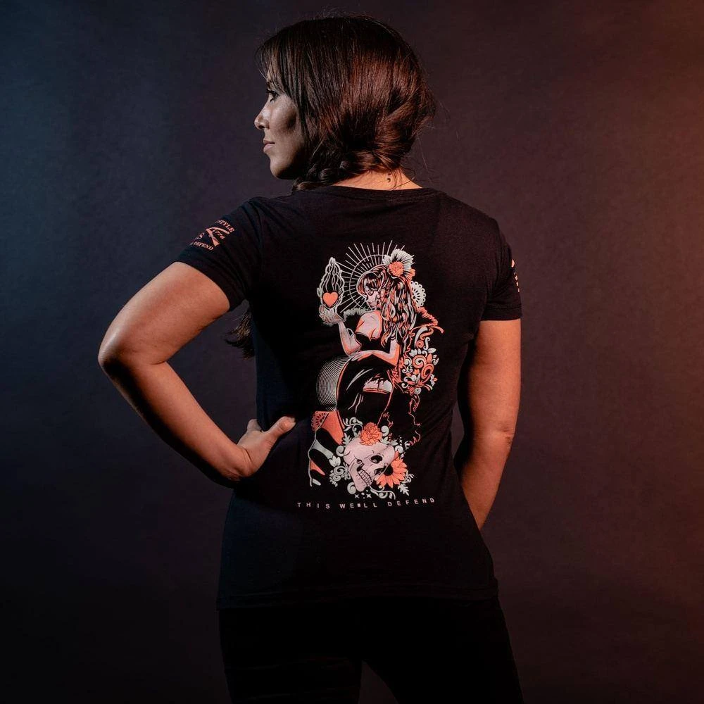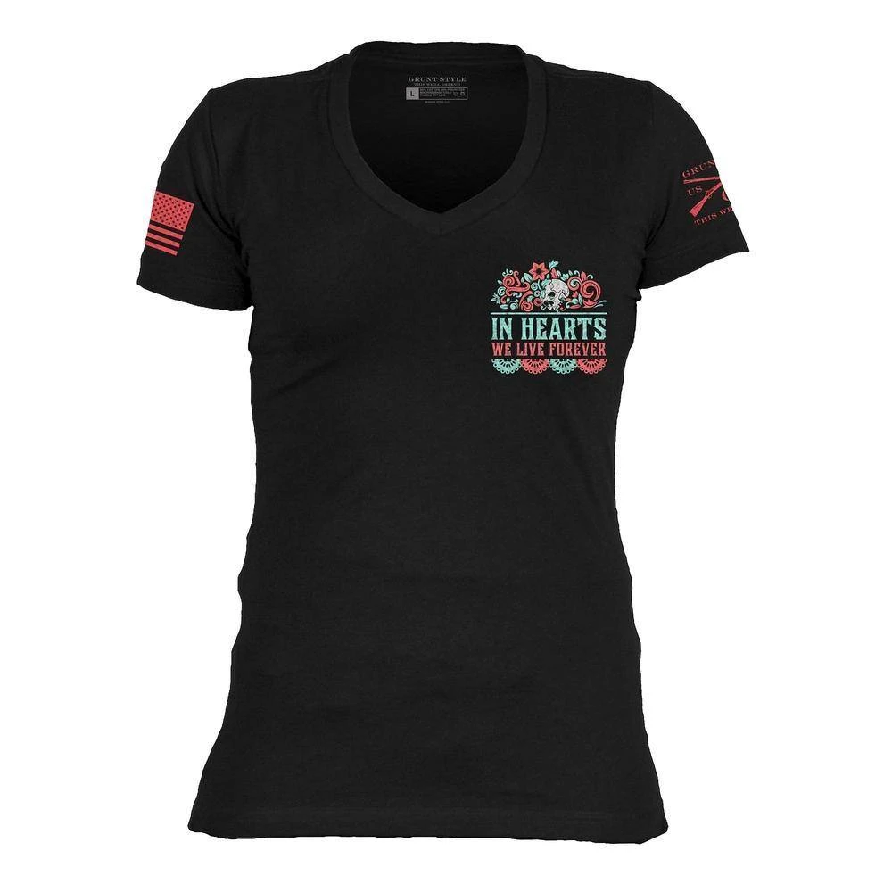 Honor the everlasting memories of the dearly departed with this Women’s In Hearts We Live Forever V-Neck shirt. Featuring a Day of the Dead-inspired design, this piece of apparel will show your love – and passion – for those who will be remembered forever. Celebrate the legacy!
